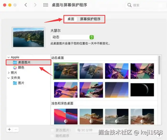 步骤1:打开【系统偏好设置】,选择【桌面与屏幕保护程序】。在左侧栏中选择【桌面】选项卡。