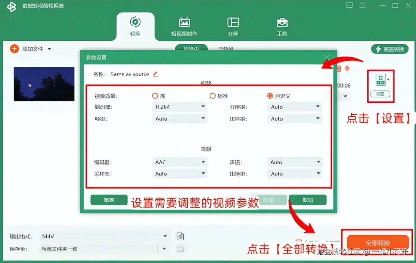步骤3:点击m4v转mp4列表的 【设置】 选项,设置需要调整的视频参数,最后点击下方的 【全部转换】 即可。