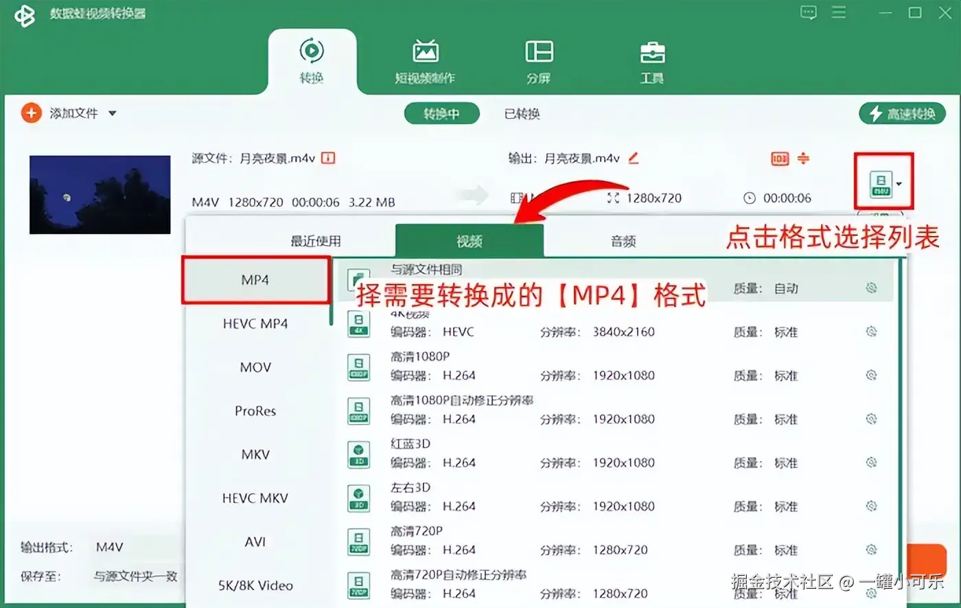 步骤2:在视频格式转换列表中,点击m4v视频选项右侧的格式选择列表,选择需要转换成的 【MP4】 格式。