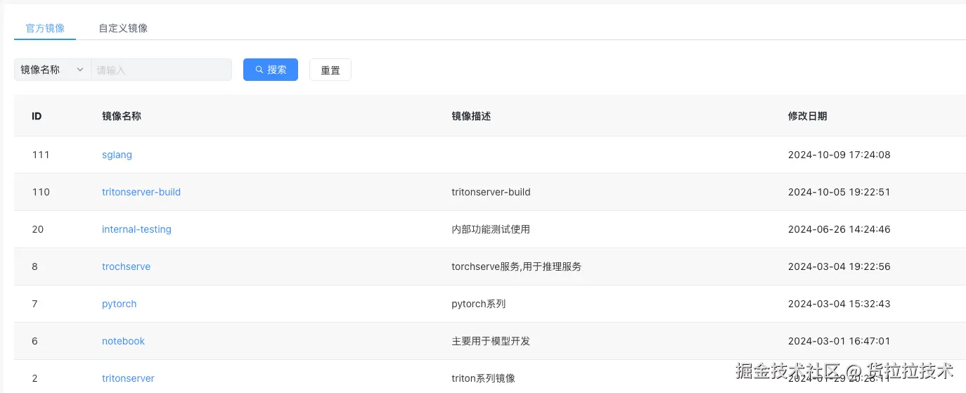 - 平台内置镜像: 海豚平台内置了多种常见的机器学习、深度学习、大模型相关的的开发和推理镜像(如 Triton、TensorRT-llm、Vllm)