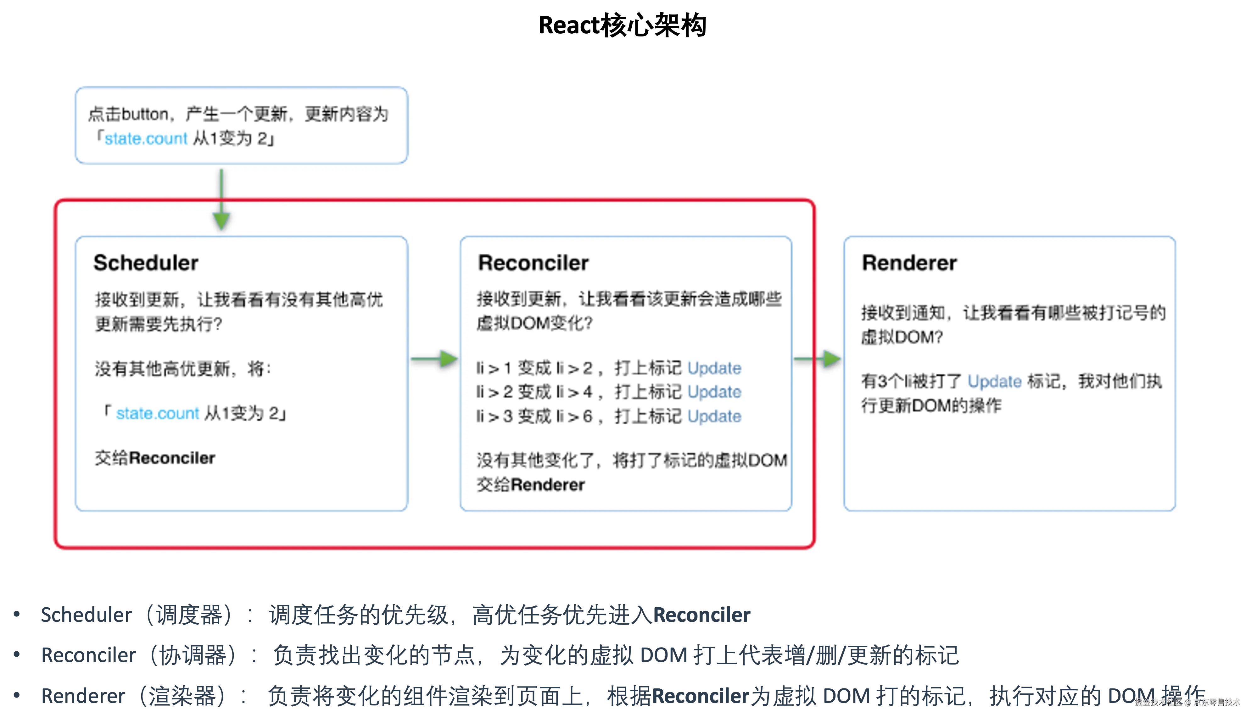 在 Taro 的运行时中,首先执行的是开发者编写的 React 业务代码。这些代码定义了业务应用的结构、逻辑和状态管理。那么既然要对接React,那肯定先得了解它的核心架构,React是怎么运作的: