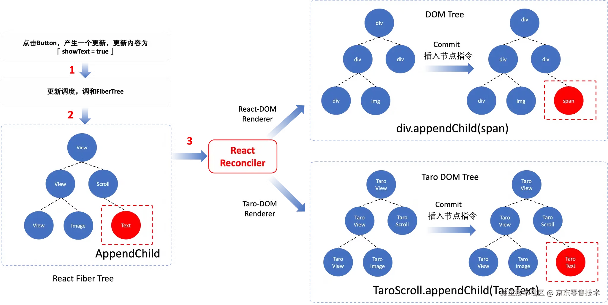 正是基于这种思路,Taro 团队设计了 Taro Renderer。这个渲染器充当了 React 与 Taro 虚拟节点树之间的桥梁,使得 React 的操作可以被转换为 Taro 的中间表示。