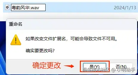 步骤2:用鼠标左键单击一下空白处或者按下键盘上的【Enter】键确认更改,系统会提示是否要更改文件格式,选择【是】,音频文件就转换成功啦。