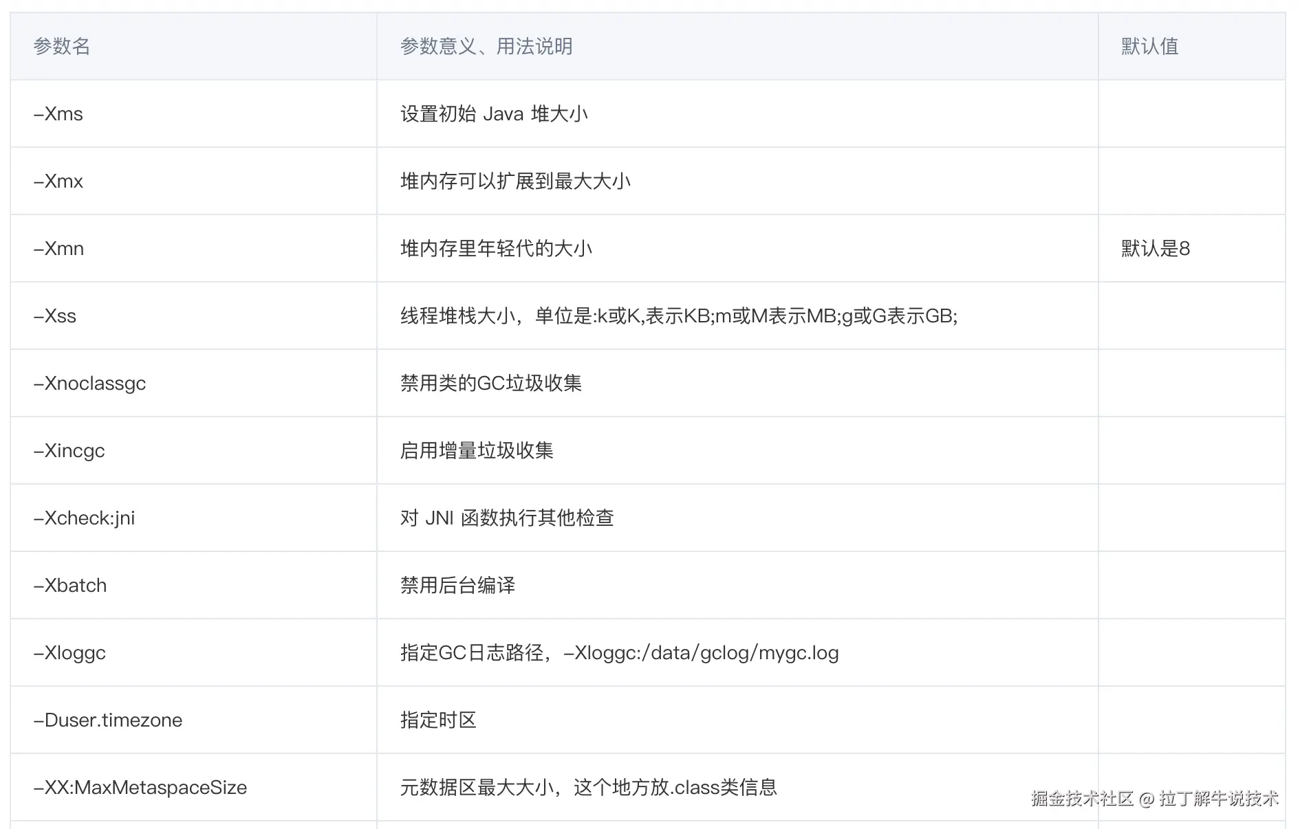 粗略统计了一下,JDK8 JVM全部参数加起来有将近800个,实际我们常用的以及调优参数大概100多个,这里我们重点列举核心常用的参数。【掘金目前不支持表格,这里展示有点麻烦,表格类似截图那样效果】,为了方便大家阅读,冒昧放个其他平台链接,也是本文原创:《JVM参数详解表格,在此链接文末》