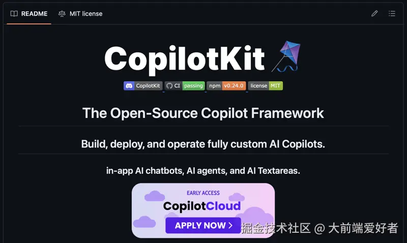 CopilotKit提供了一种简单快速的解决方案,帮助你在React应用中集成生产就绪的AI助手。你可以通过两个React组件来集成关键的AI功能,并且他们提供了可定制的原生用户体验组件,如<CopilotKit /> 、<CopilotPopup />、<CopilotSidebar />、<CopilotTextarea />。