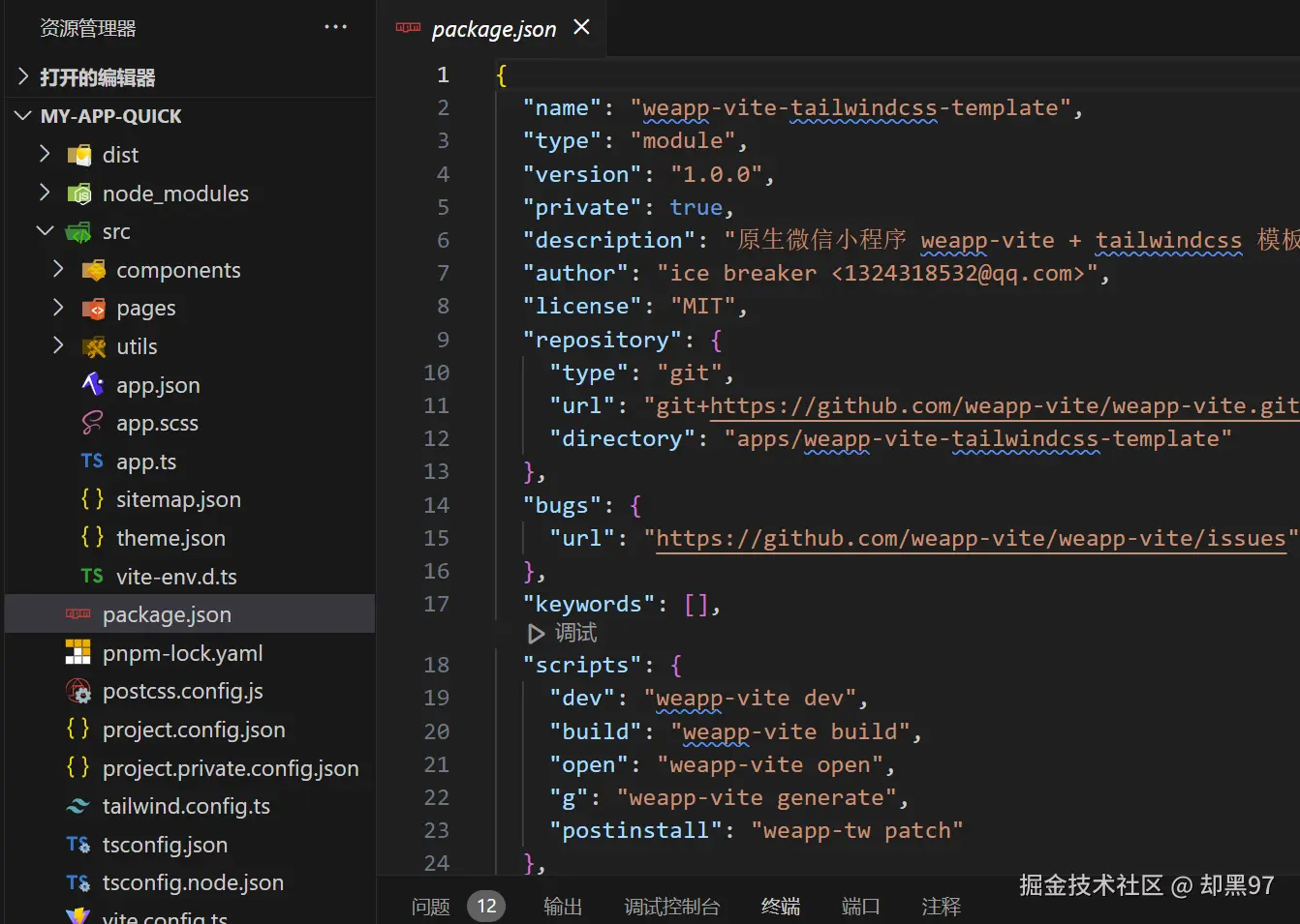 npx weapp-vite create my-app,然后执行pnpm i 安装依赖包,得到以下结构: