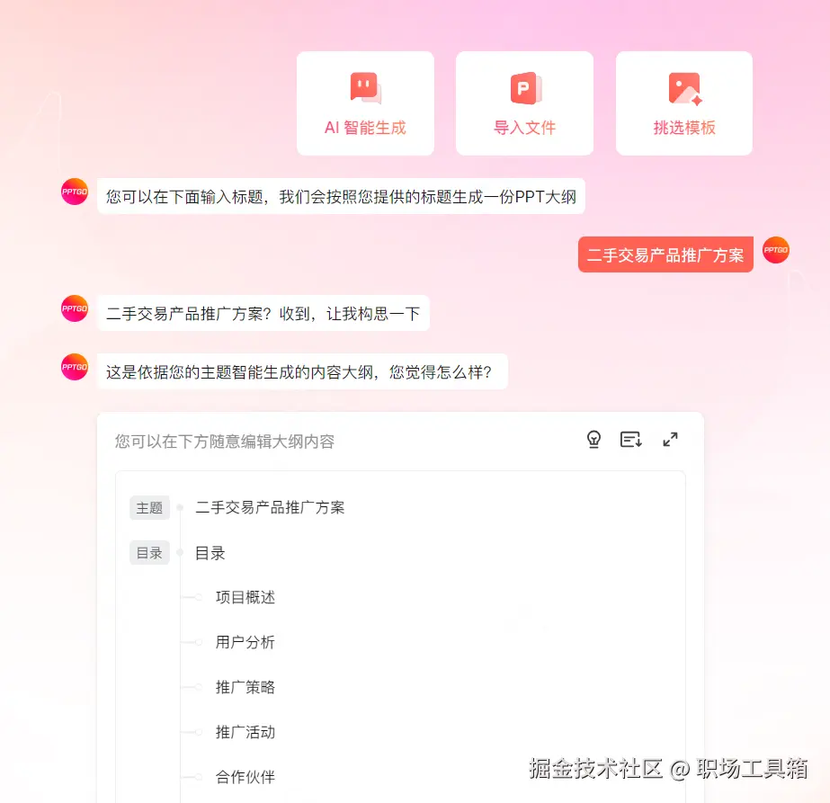 博思AIPPT能够根据用户输入的关键词、大纲或导入的各类办公文档,智能生成结构清晰、内容充实的PPT。用户只需在输入框中输入PPT主题,例如“二手交易产品推广方案”,按下回车键,下方就会返回相应的PPT大纲。