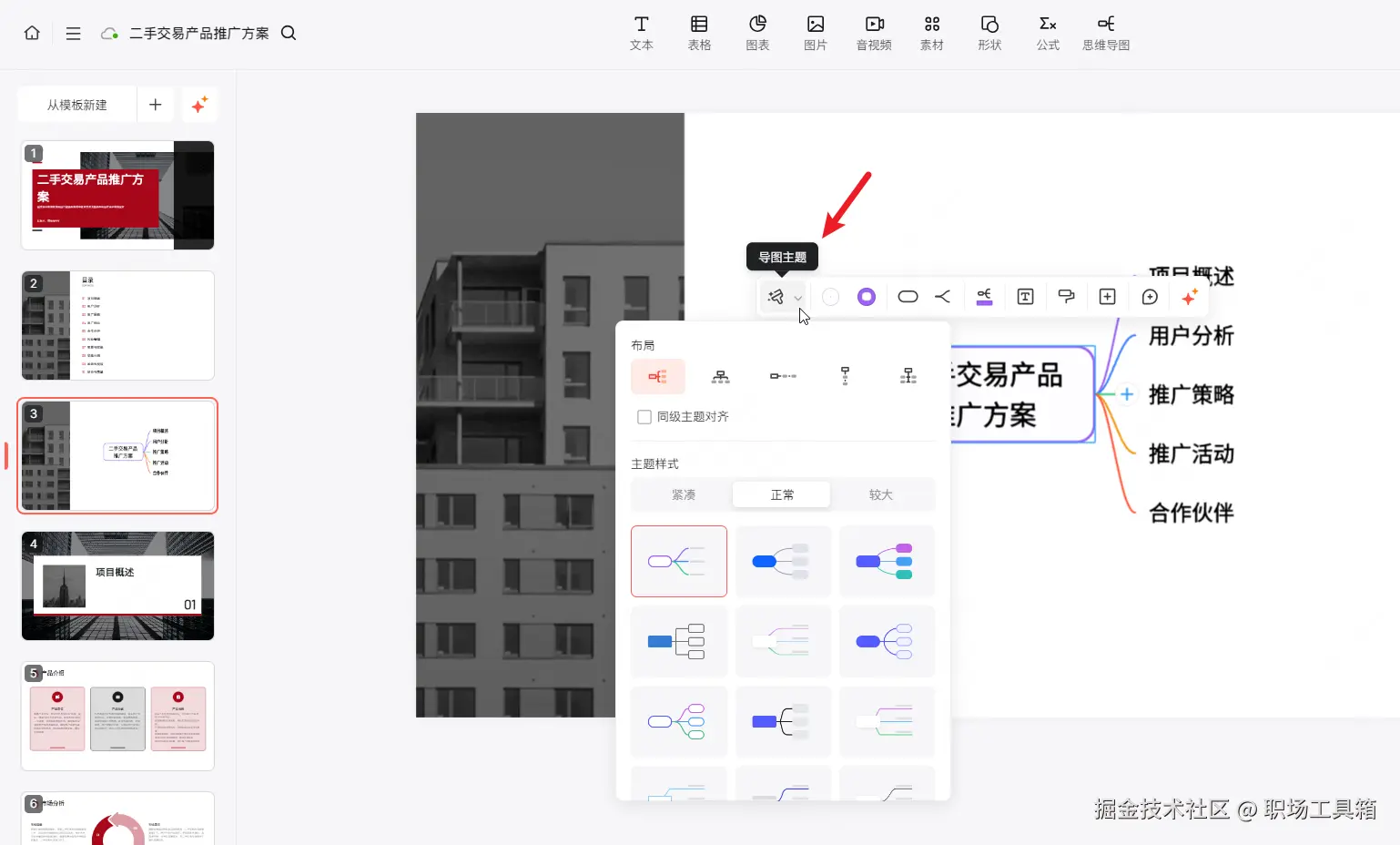 在博思AIPPT顶部的工具栏,可以看到博思AIPPT内置的思维导图功能,点击按钮,会弹出面板,可选择思维导图布局和主题样式,如左右布局、上下布局、树状布局等,以及正常、紧凑、较大等主题样式。