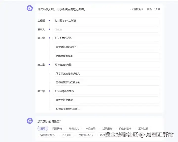 工具会根据视频内容先生成大纲,可以自行添加、编辑、删除。可以选择场景,课题研究、产品演示、个人简历等等。
