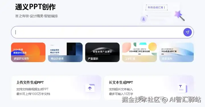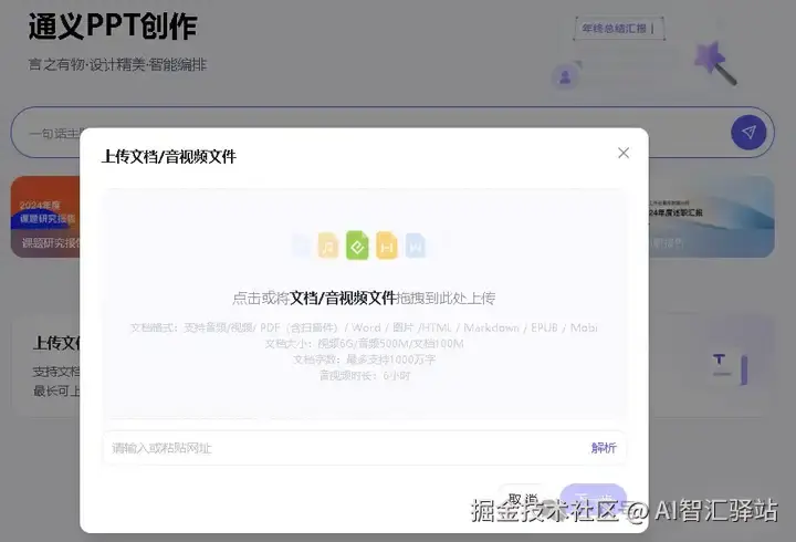 支持一句话生成PPT,可以上传文档、音频、视频生成PPT。上传的文档字数最长可达1000万字。