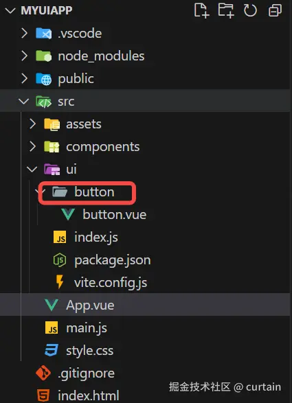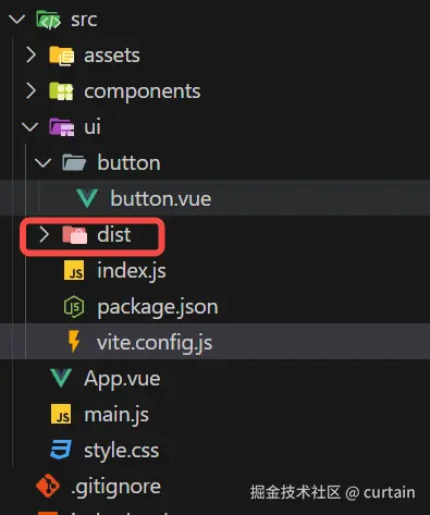 Button.vue 注意此处多加一个button文件夹使打包目录更清晰啊,满足按需引入