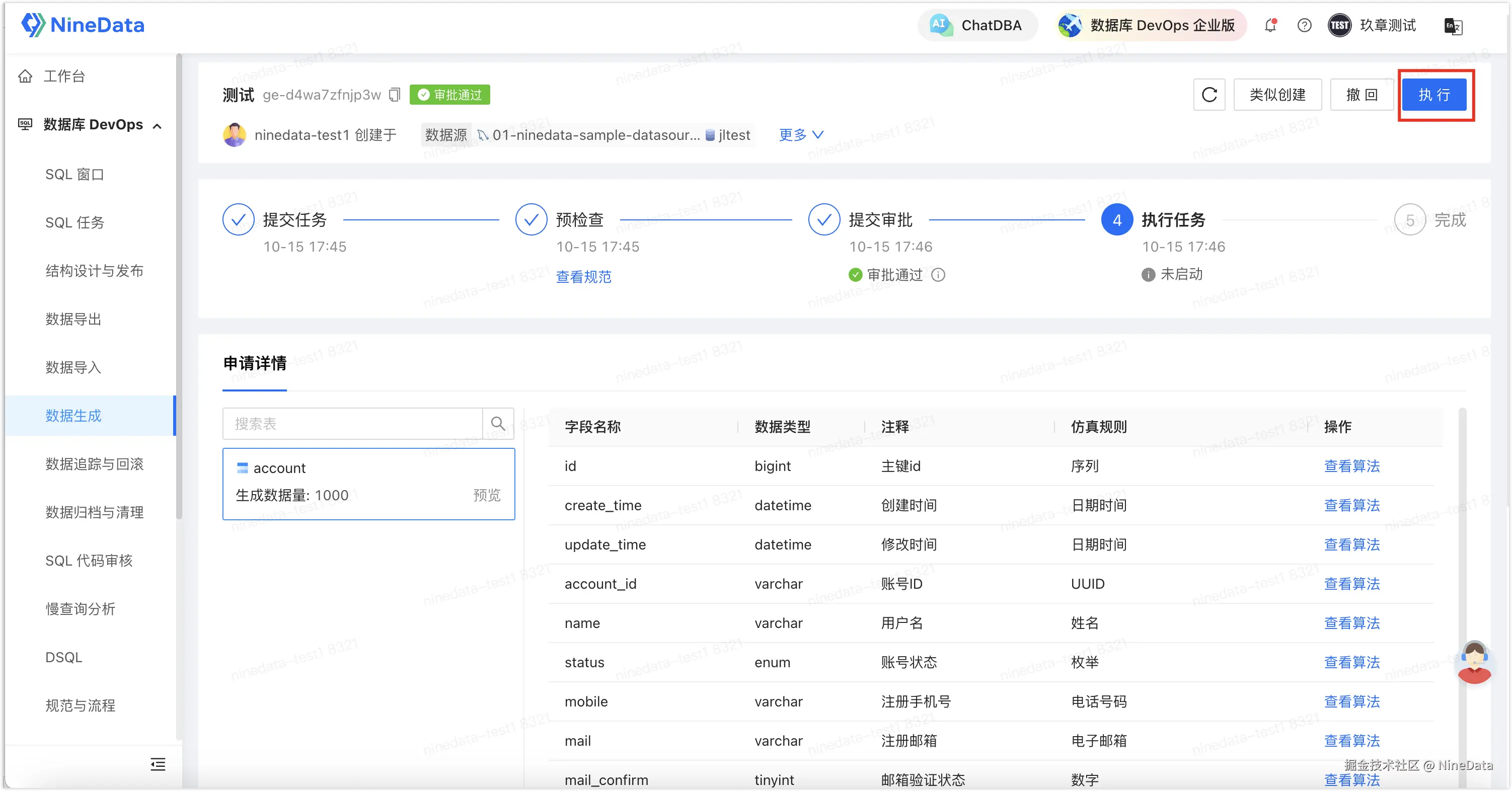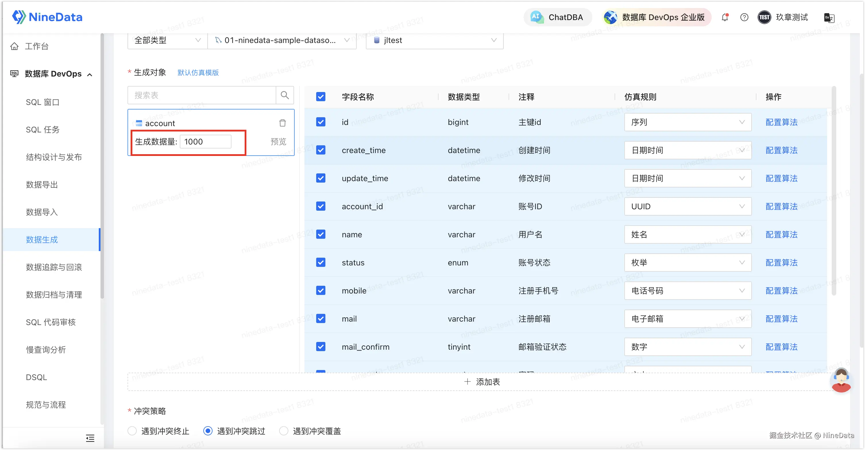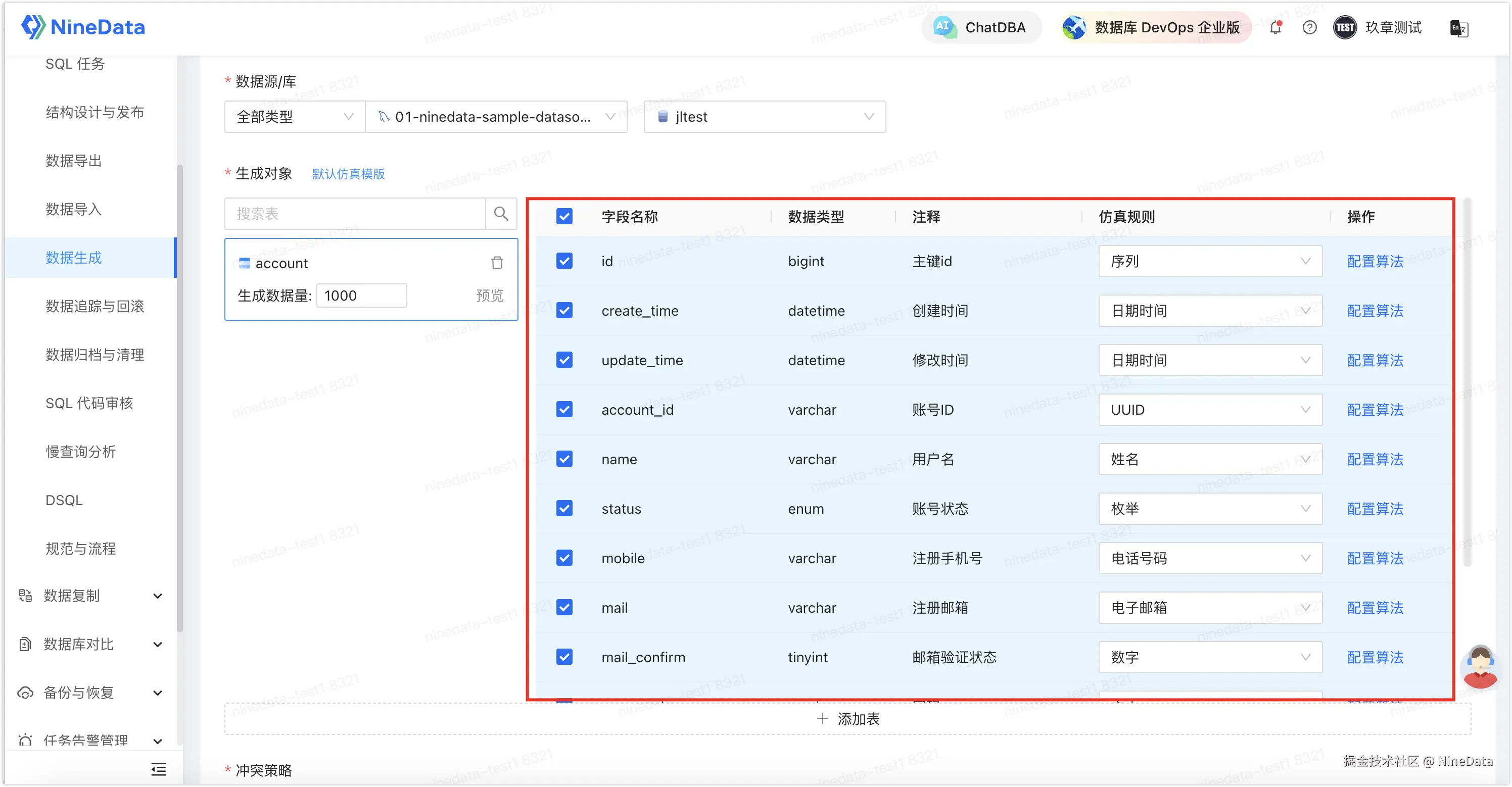 长篇大论总结为一句话:根据自身业务逻辑创建的有意义的测试数据才能让测试结果更加可靠。这样一来,从网上获取开源数据集,或者用 sysbench 创建随机字符串就都无法满足了,我们需要一种可以根据自身业务逻辑,来自动生成真实测试数据的方法,那就不得不提一提 NineData 最新推出的数据生成功能了。
