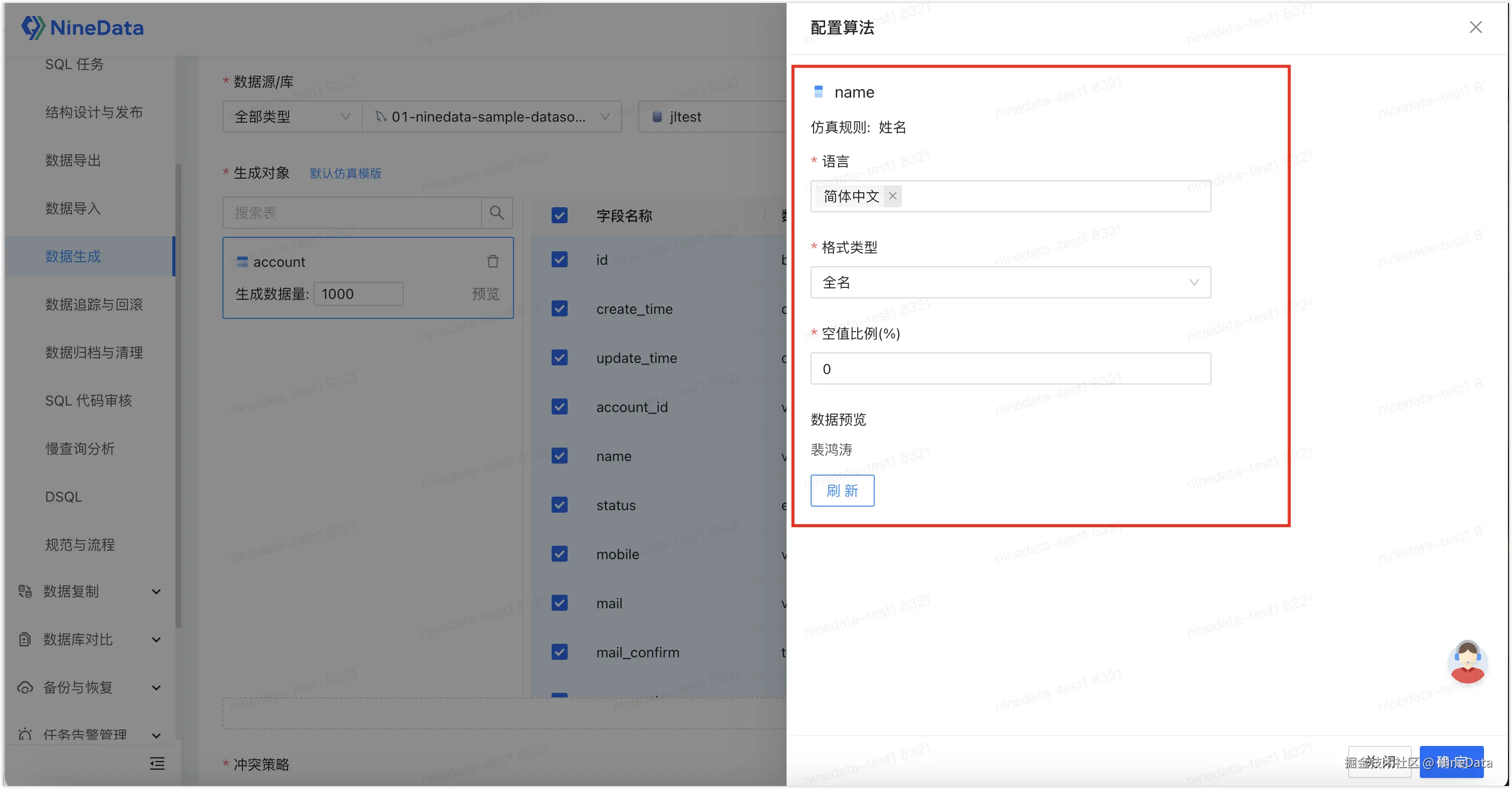 NineData 支持在数据库中自动生成符合特定业务场景的随机数据,用于模拟实际生产环境中的数据情况,帮助用户在不使用真实数据的情况下,进行功能测试、压力测试以及其他验证工作。