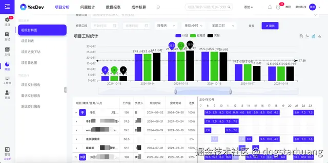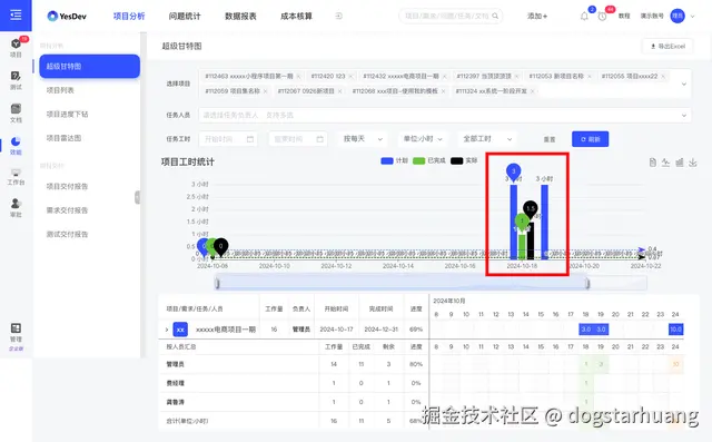 合并多个项目,在查看项目甘特图的同时,查看对比每天的工时统计。