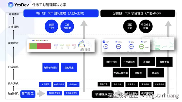 一方面,To Team 团队工时登记,指面向人员、团队、部门、研发团队的工时登记、效率提升和工作任务安排,由技术经理、总监、技术管理角色统筹,即组织结构的实线技术管理;另一方面,To Project 项目工时登记,用于单个项目、多个项目、项目集、产品线项目的工时、进度、计划、成本核算,由项目经理、PMO角色把控,属于虚线跨团队协作和管理。