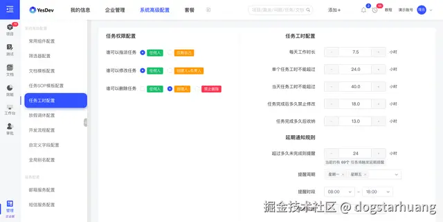 权限、每天工作时长等常用配置。