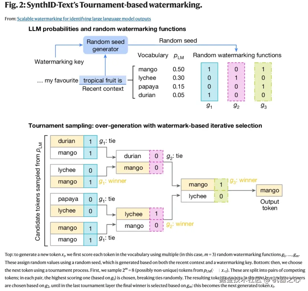 简单举个例子,对于短语「我最喜欢的热带水果是__」,LLM 可能会使用 token「芒果」、「荔枝」、「木瓜」或「榴莲」来完成句子,并且每个 token 都会给出一个概率分数。当有一系列不同的 token 可供选择时,SynthID 可以调整每个预测 token 的概率分数,以免影响输出的质量、准确性和创造力。