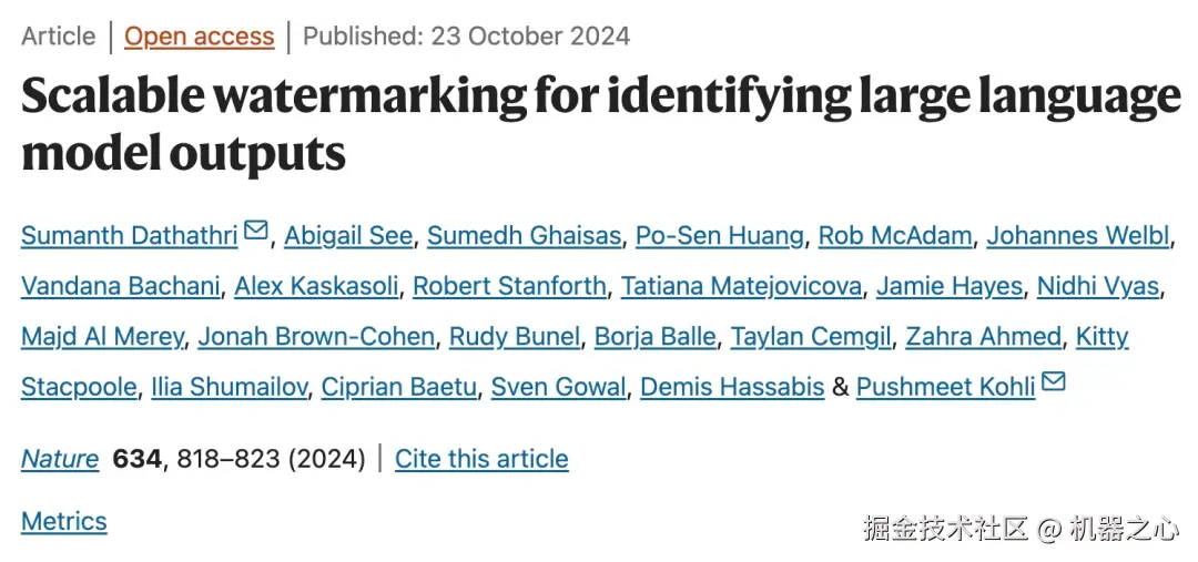 谷歌开发的 SynthID 文本水印技术登上了最新一期 Nature 杂志封面,之前机器之心已经报道过该公司开发的图像水印技术,参阅《给 AI 生成图像「加水印」,谷歌发布识别工具 SynthID》。