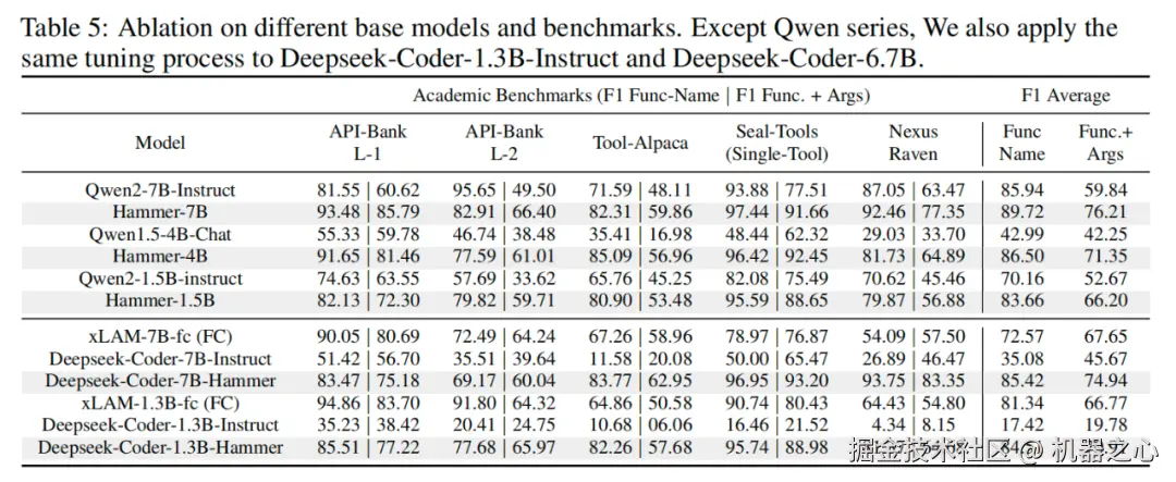研究团队还将函数掩码和数据增强技术应用于不同的基础模型,以验证其通用性。实验选择了 Qwen 系列和 Deepseek-Coder 系列模型作为基准,并在相同的训练和测试条件下进行比较。下表中的结果显示,经过函数掩码技术调优后的 Hammer 版本显著提升了基础模型的工具调用准确性,远高于未调优版本,证明了函数掩码和不相关性数据增强对不同模型架构均有显著的优化效果。同时,在使用相同的基座模型和基础数据的情况下,与 xLAM(同样基于 Deepseek 微调而来的工具调用模型)的对比,也体现了函数掩码及不相关性数据增强的作用。
