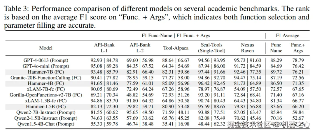 Hammer 系列模型在工具调用典型评测基准上均展现了出色的性能,具体表现如下面的两张表格所示。可以看到,在 BFCL 榜单上,Hammer-7B 模型的总体准确率达到 83.92%,接近闭源 SOTA 模型 GPT-4 的 95.79%,优于其他工具调用模型。同时,在其他评测基准上,Hammer-7B 模型的平均 F1 达到 76.21%,接近闭源模型 GPT-4 的 78.79%,大幅领先其他工具调用模型。Hammer-7B 能够在参数规模较小的情况下,在不同评测基准上与闭源 SOTA 大模型竞争,充分展示了 Hammer 模型在各种工具调用任务中的准确性和稳定性。