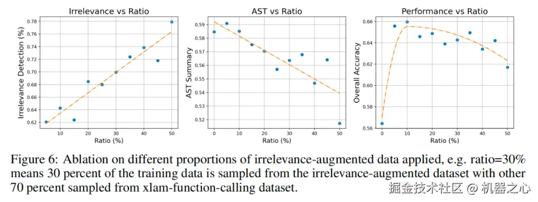 在设计不相关性数据增强时,研究团队测试了不同比例的不相关性数据样本对模型表现的影响。下图实验结果表明,合理比例的不相关性增强数据(约占总数据的 10%)能够在提升工具调用准确性的同时,显著增强模型在不相关检测场景中的识别能力,降低错误调用的风险。实验结果还显示,进一步增加不相关性数据会略微降低功能调用的准确性,因此找到适当的平衡点至关重要。