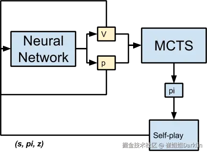 所以这里需要有一个办法来利用值函数的信息来优化这个策略。在AlphaGo系列算法里面是使用蒙特卡洛树搜索(MCTS)来进行策略优化的。MCTS的输出pi是依据值函数V得到的一个更优策略,它将被用于通过self-play来生成数据供深度神经网络学习。MCTS也是AlphaGo能够通过self-play不断变强的最重要的原因。
