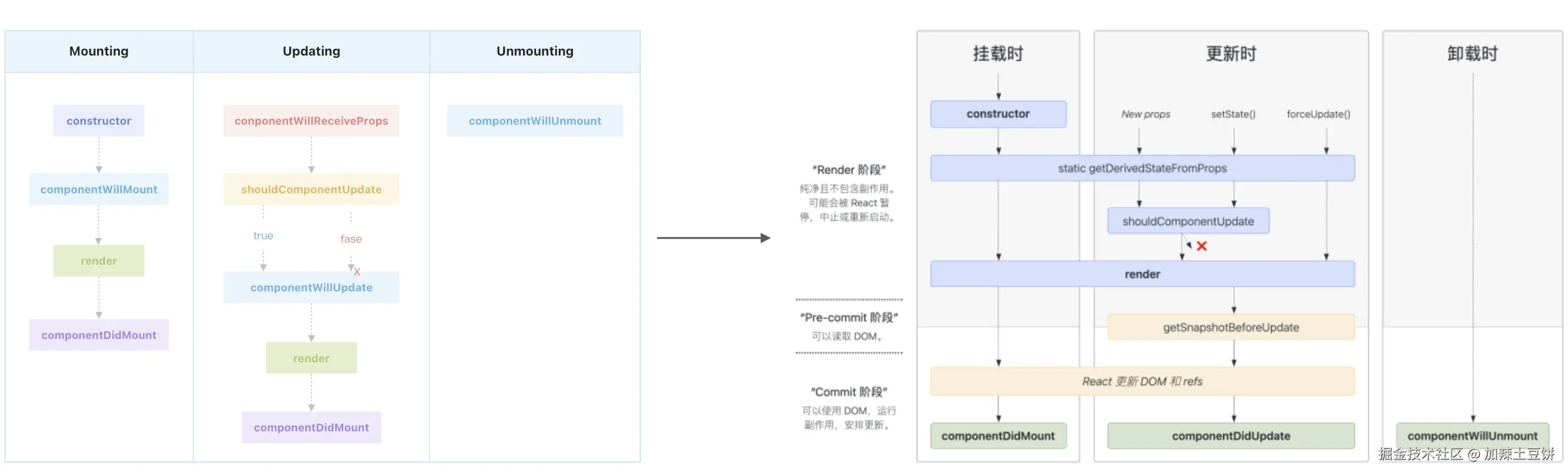 通过对比不难发现,React 在新的生命周期中废弃了 componentWillMount、componentWillReceiveProps 和 componentWillUpdate 这三个方法,新增了 getDerivedStateFromProps 和 getSnapshotBeforeUpdate 这两个方法。