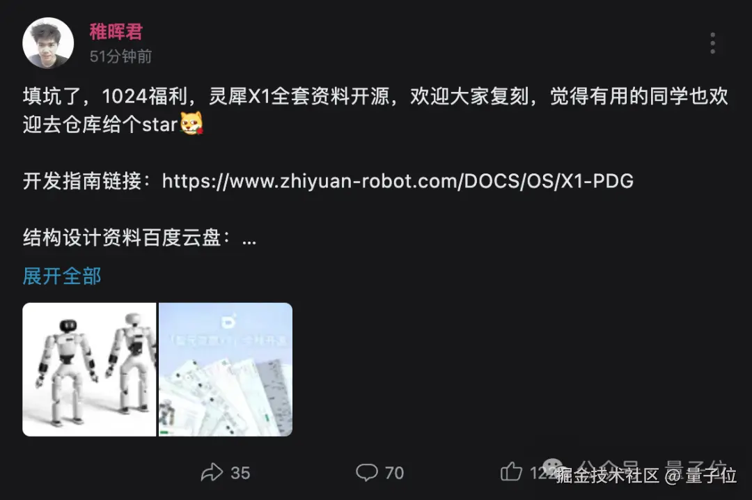 而这次的开源,相当于是把稚晖君快速造机器人的秘笈分享了出来,也是兑现了当时 “人形机器人人人造” 的诺言。