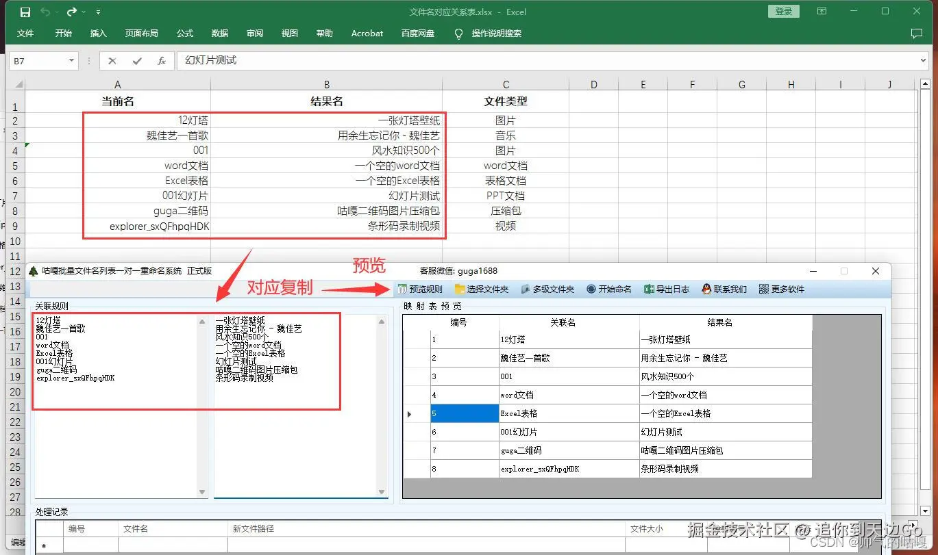 然后、将文件名对应的复制到【当前名】和【结果名】进行预览对应的关系