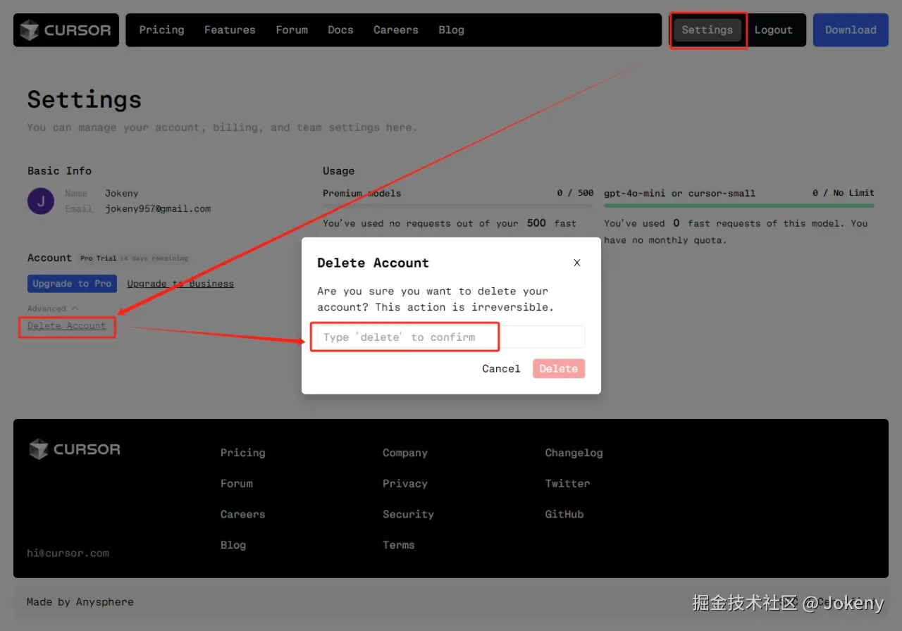 点击右上角的“Settings”按钮,然后左下方有一个“Advanced”,点击展开有一个“Delete Account”,点击后在弹出的输入框中输入“delete”