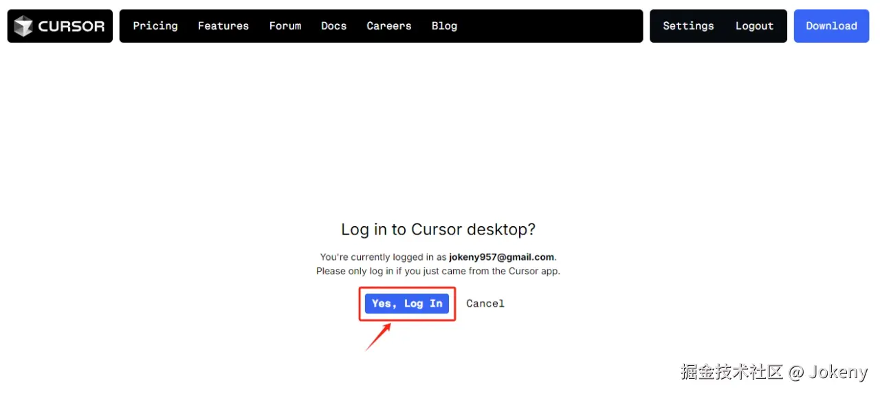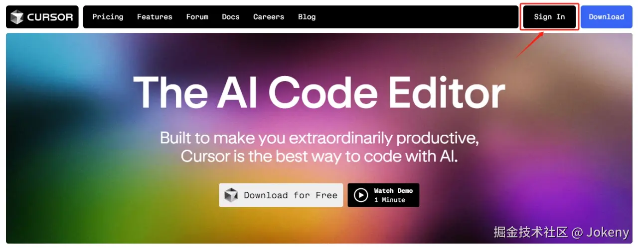 返回网页中的 Cursor 官网,然后点击右上角的“Sign In”,进入登录页面。