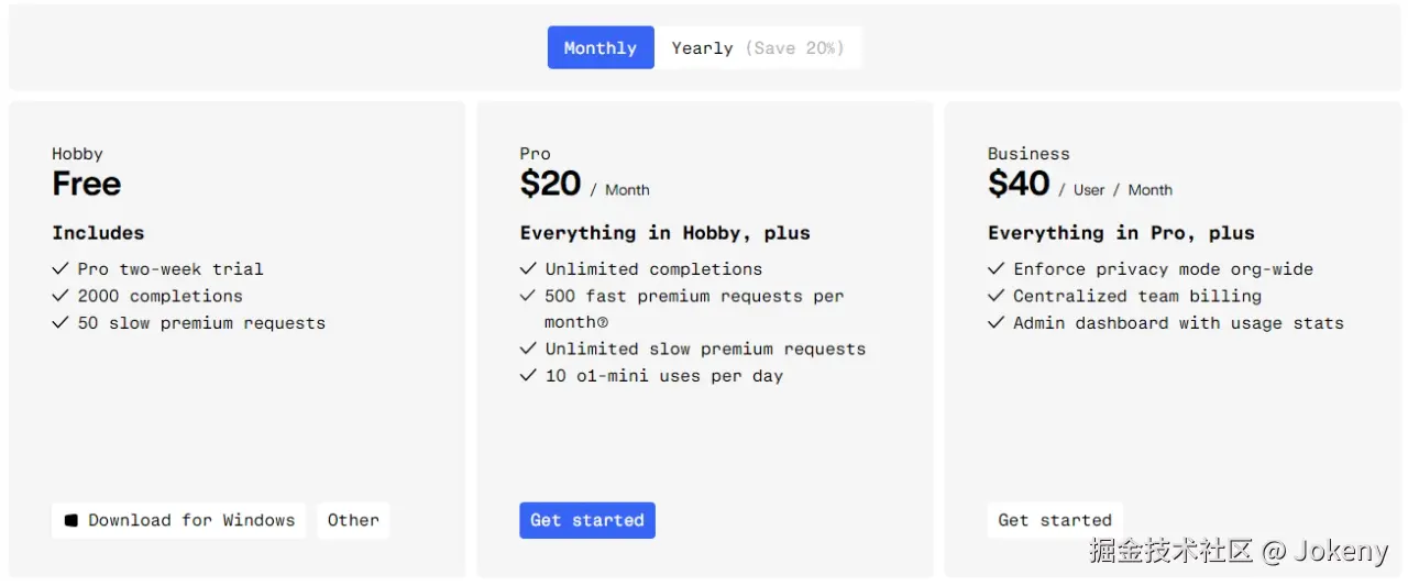 刚刚因为是新账号登录,按照 Cursor 的官方规则,新账号会获得两周的专业版试用,也就是获得500次快速高级请求、每天 10 次 O1-mini 请求和无限次的慢速请求。