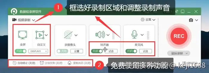 步骤2:在录制前,我们可以自由调整录制区域和录制的声音,还能免费使用自动停止、计划任务和高清无水印录制等功能。