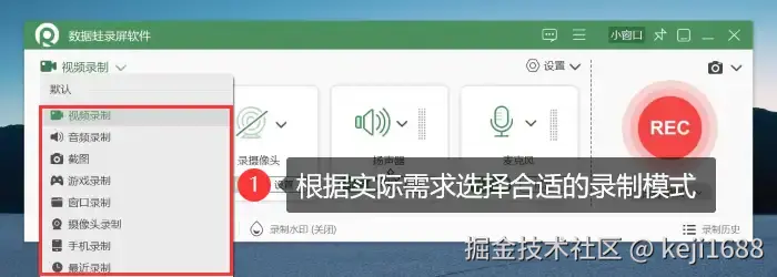 步骤1:首先我们在电脑上启动数据 蛙录屏软件,在软件主页的左上角上根据实际需求选择合适的录制模式。