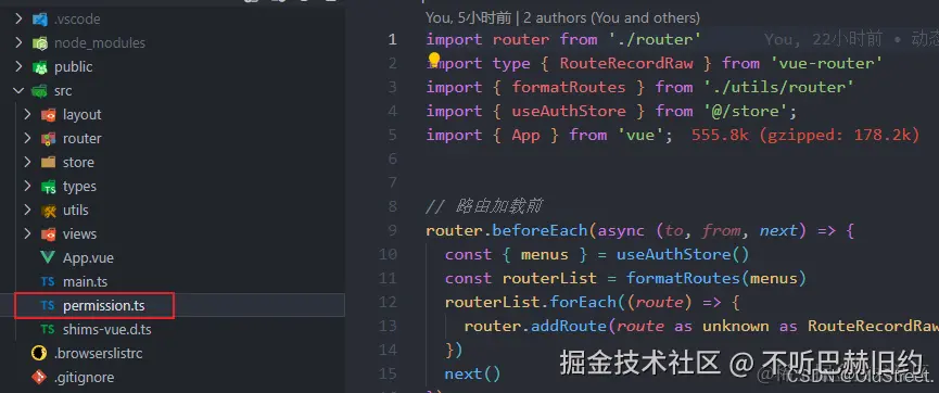 // permission.tsimport router from './router'import type { RouteRecordRaw } from 'vue-router'import { formatRoutes } from './utils/router'import { useAuthStore } from '@/store';import { App } from 'vue';
