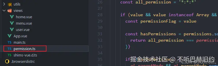 可以通过自定义指令来完成,permission.ts 中定义一下