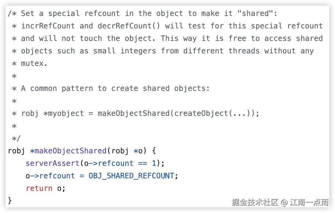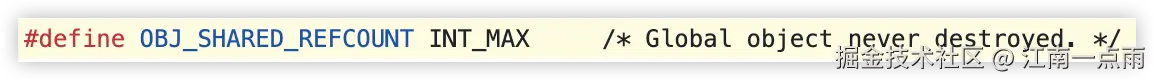 并且从源码中可以看到当把一个对象设置为共享时候就会把 refcount 设置为 INT_MAX。