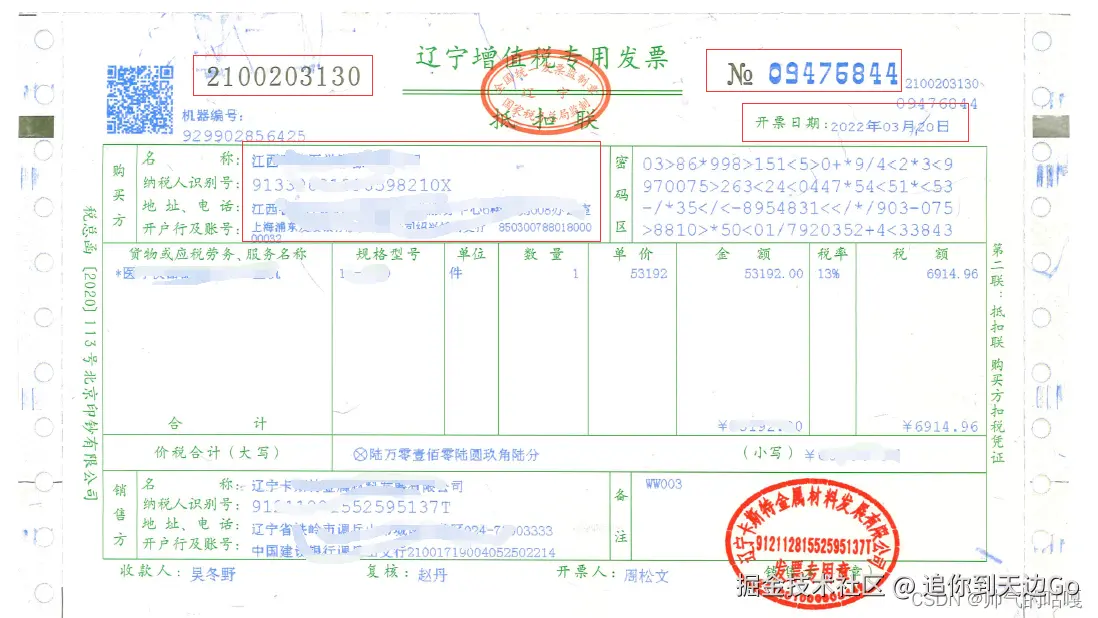 就比如这些红色方框固定位置,多张发票位置依旧是不变的,那我们就很容易根据坐标去拿到发票号,发票日期,发票的购买方和销售方的信息,给切片出来然后递交ocr进行光学处理,识别后进行字符拼接新旧文件名利用File类的moveTo方法进行操作