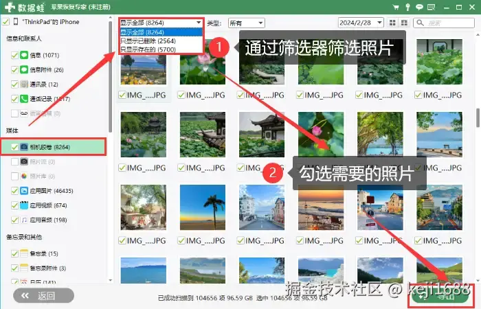 步骤2:扫描结束后,点击 【相机胶卷】 选项并通过筛选器选择需要的照片,勾选后进行恢复并导出保存。