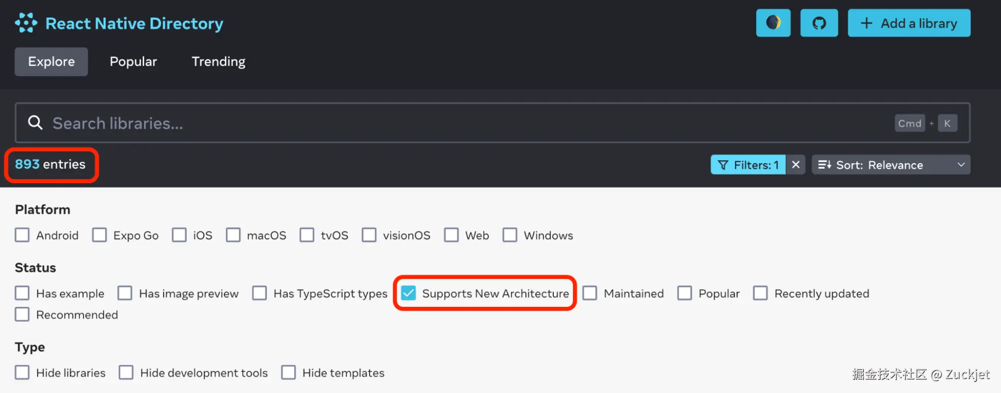 我们已与最流行的 React Native 库合作,以确保对新架构的支持。超过 850 个库已兼容新架构,包括所有每周下载量超过 20 万次的库(约占下载库的 10%)。您可以在 reactnative.directory 网站上检查库与新架构的兼容性: