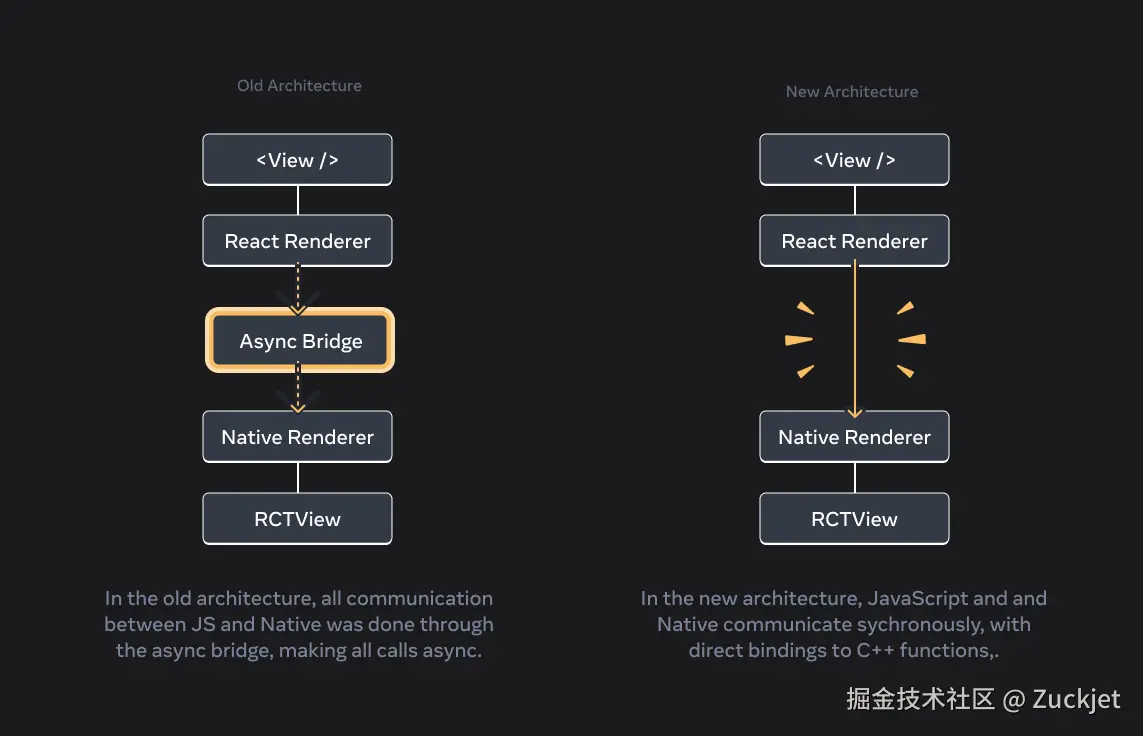 在旧架构中,React Native 使用异步桥接与原生平台通信。为了渲染一个组件或调用一个原生函数,React Native 需要将原生函数调用序列化并通过桥接队列化,这些调用将被异步处理。这种架构的好处是,主线程不会因渲染更新或处理原生模块函数调用而被阻塞,因为所有工作都在后台线程完成。