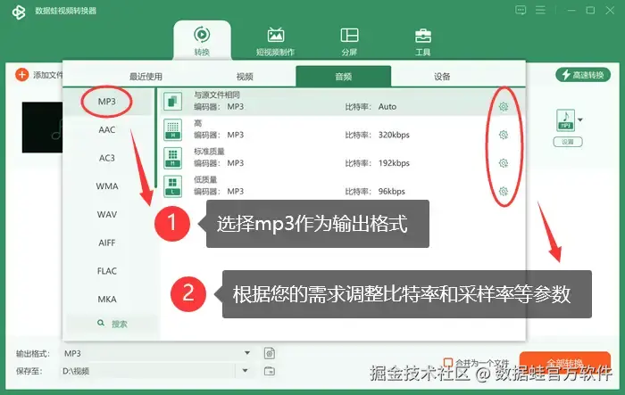 选择mp3作为输出格式,并根据您的需求调整转换参数,例如比特率和采样率等。