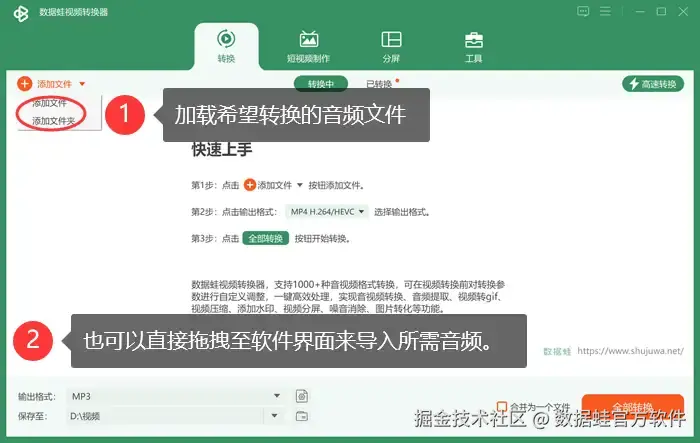 先启动数据 蛙视频转换器,然后加载您希望转换的音频文件。您可以通过将文件直接拖拽至软件界面或者点击界面上的 【添加文件】 按钮等方式来导入所需音频。
