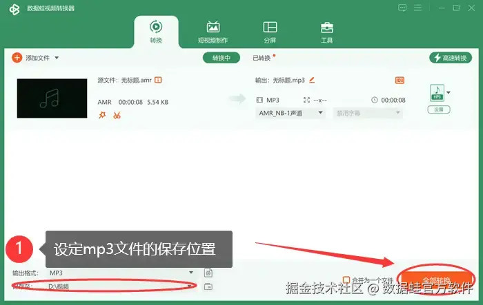 设定转换后mp3文件的保存位置。一旦设置完成,点击 【全部转换】 按钮,数据 蛙将启动音频到mp3格式的转换过程。