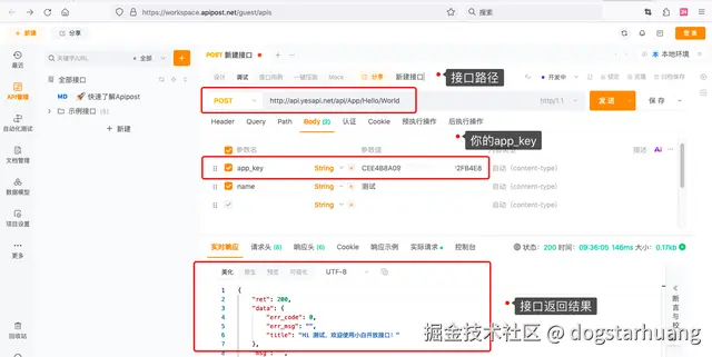 API接口在调用也非常简单,你可以用 Postman/ApiFox/ApiPost 等工具,进行接口调用和测试,只需要填上需要调用的接口路径、你的接口域名和app_key即可(注册账号后可免费获得)。