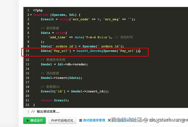 下面的代码,除了第10行用base64_decoce()解码函数外,其他代码都是平台帮我生成的。