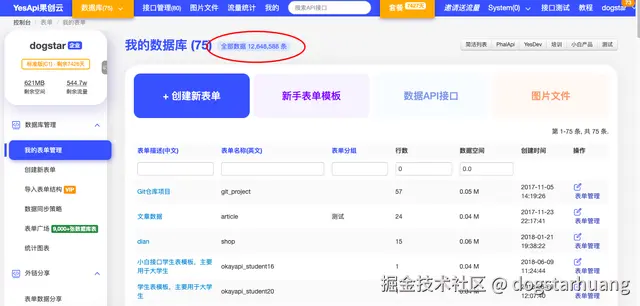 小白接口,即果创云更牛X的事是,它可以帮我存很多数据。这几年下来,刚看了一下,这个平台已经帮我这个技术小白存了75个表单、全部数据 12,648,588 条!乖乖、太牛了!