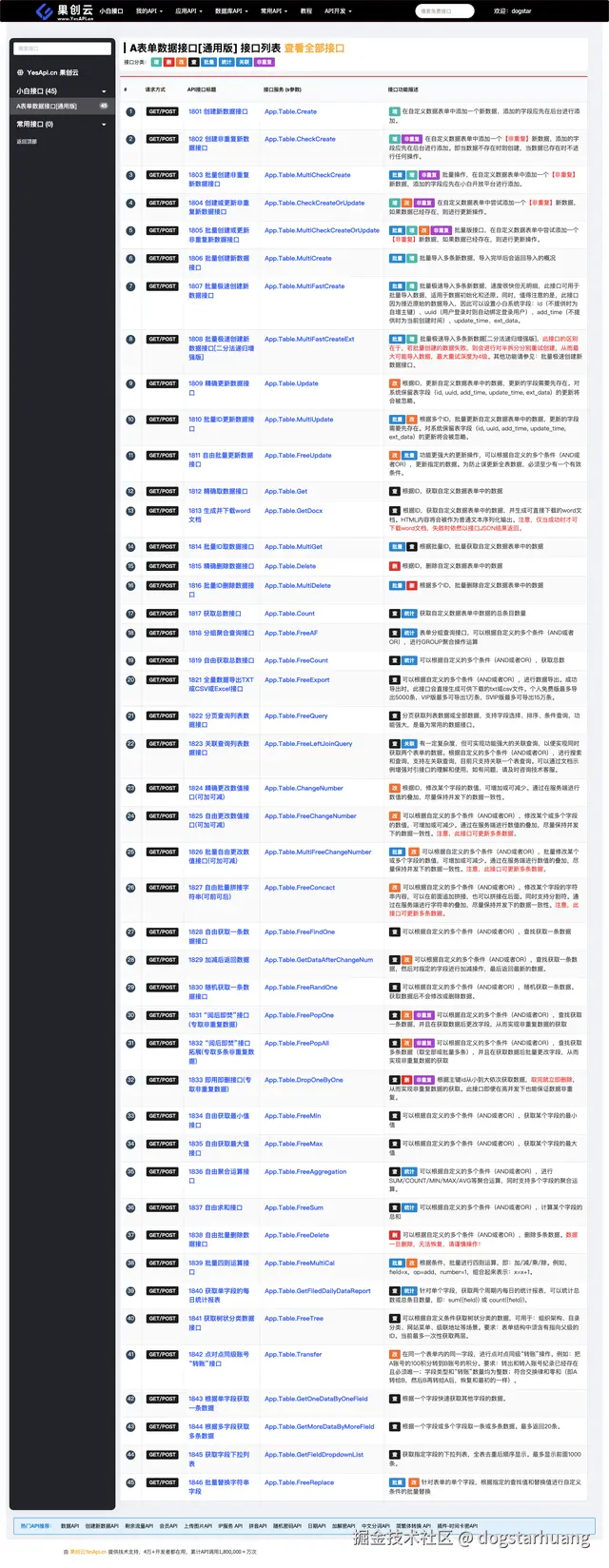 例如,表单数据接口,接口分类有: 增 删 改 查 批量 统计 关联 非重复。是应用开发的常用必备的接口。截图,