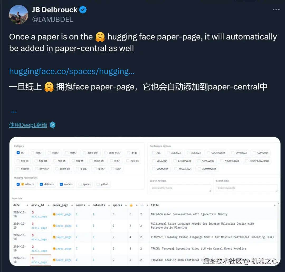 Hugging Face 基础机器学习研究员 JB Delbrouck 提到,一旦一篇论文被放到 Hugging Face 论文页面上,这篇论文将被自动添加到「Paper Central」上。