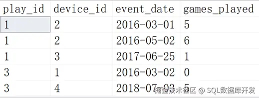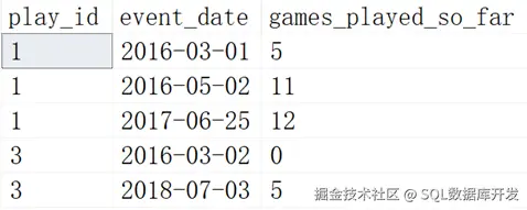 其中games_played是玩家登陆玩的游戏数量, 查询每个玩家每天累计玩的游戏数量有多少?结果如下:
